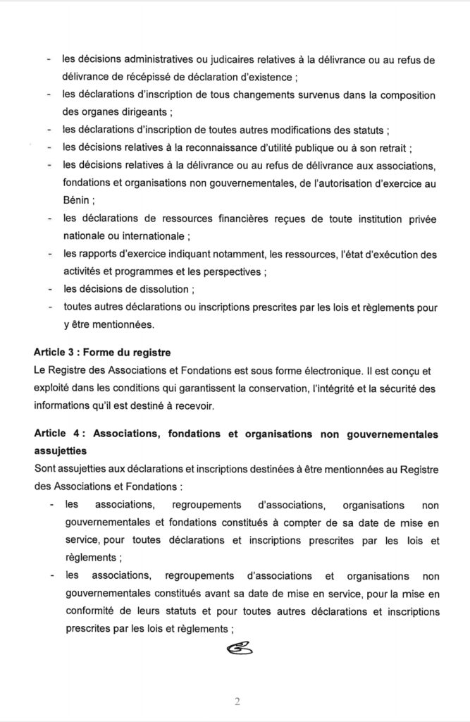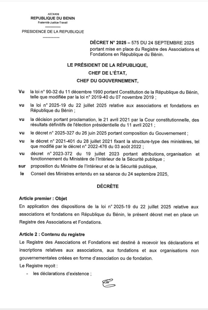 Par le décret N°2025-575 du 24 septembre 2025, le gouvernement met en place le Registre des Associations et Fondations en République du Bénin. Ledit registre est destiné à recevoir les déclarations et inscriptions relatives aux associations, aux fondations et aux organisations non gouvernementales créées en forme d’association ou de fondation.