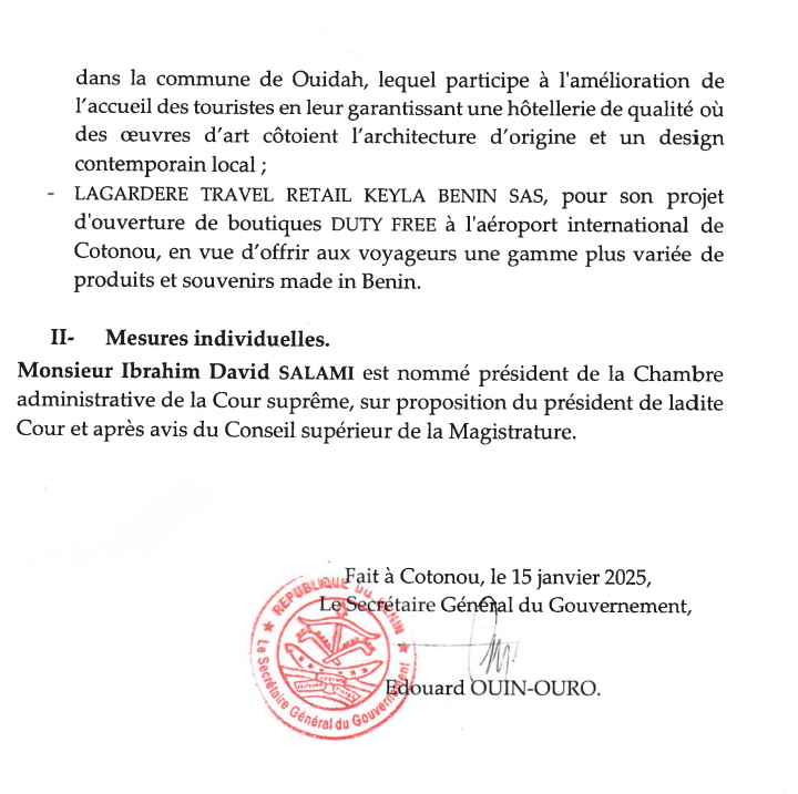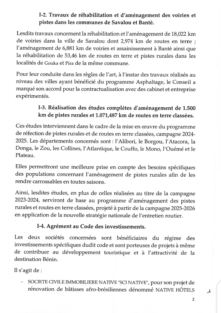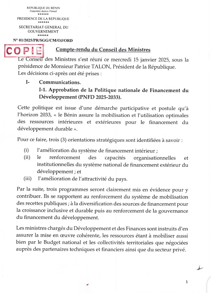 Réuni sous la présidence de Patrice Talon ce 15 janvier 2025, le Conseil des Ministres a adopté des décisions clées visant à dynamiser le développement économique et infrastructurel du pays. Parmi les mesures notables, l’approbation de la Politique nationale de Financement du Développement (PNFD 2025-2033) marque une étape stratégique vers une gestion optimale des ressources. Des projets d’infrastructure pour la réhabilitation des voiries et le soutien à l’investissement touristique ont également été validés, témoignant de l’engagement du gouvernement à améliorer les conditions de vie et à renforcer l’attractivité du Bénin.