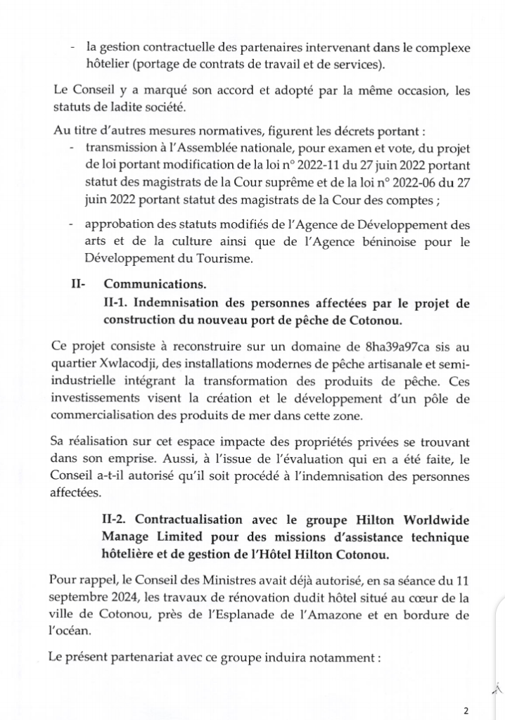 Plusieurs décisions ont été prises lors du conseil des ministres de ce mercredi 5 février 2025 qui s’est déroulé sous la présidence du Chef de l’État, Patrice TALON. Parmi les décisions qui sont issues de cette rencontre des membres du gouvernement, l’indemnisation des personnes affectées par le projet de construction du nouveau port de pêche de Cotonou. Des mesures sont prises à cet effet pour sa mise en œuvre effective.
