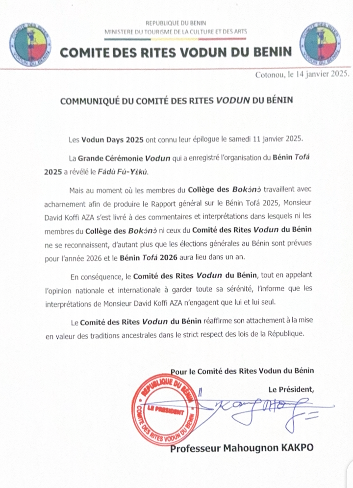Pour Mahougnon KAKPO et les autres membres du comité, »…au moment où les membres du Collège des Bokonon travaillent avec acharnement afin de produire le rapport général sur le Bénin Tofâ 2025, Monsieur David Koffi AZA s’est livré à des commentaires et interprétations dans lesquels ni les membres du collège des Bokonon ni ceux du comité des rites Vodun du Bénin ne se reconnaissent, d’autant plus que les élections générales du Bénin sont prévues pour l’année 2026 et le Bénin Tofâ 2026 aura lieu dans un an »