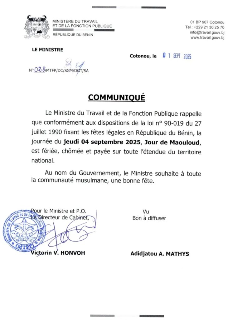 Par un communiqué, la Ministre du Travail et de la Fonction Publique annonce que la journée du Jeudi 04 septembre 2025 est déclarée fériée, chômée et payée sur toute l’étendue du territoire national en raison de la célébration de la fête de Maouloud.