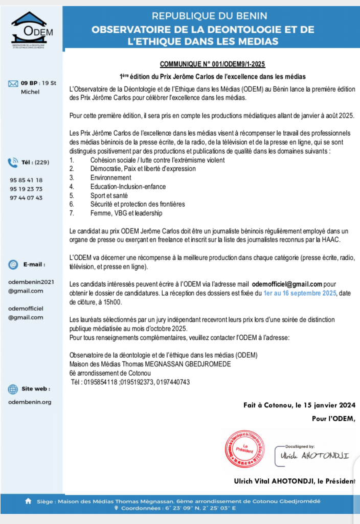 Dans le but de promouvoir l’excellence dans les médias, l’Observatoire de la Déontologie et de l’Ethique dans les Médias (ODEM) 9eme mandature a lancé ce mercredi 15 janvier 2025 à son siège à Cotonou la première édition du Prix Jérôme Carlos. La date du lancement officiel de ce concours médiatique marque l’an du décès de cette figure emblématique de la presse béninoise.