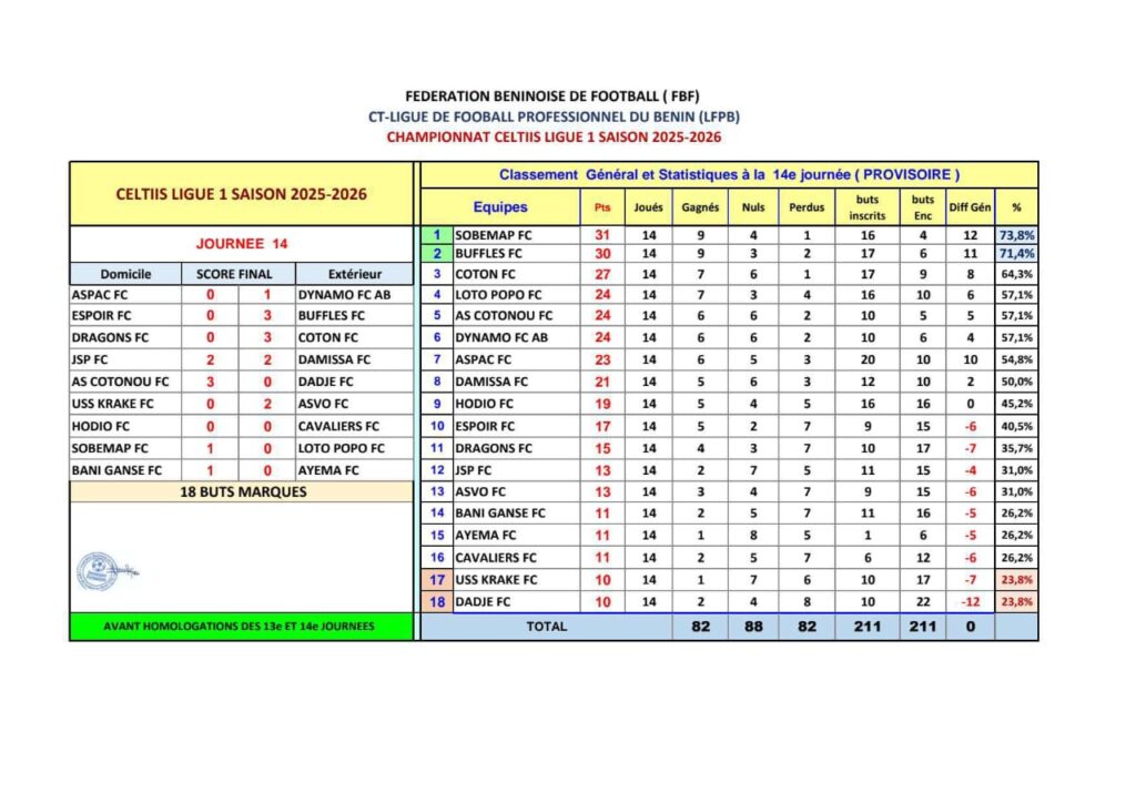 Les stades du Bénin ont accueilli les samedi 17 et dimanche 18 janvier 2026, les rencontres de la 14ème journée de la Celtiis Ligue 1. Au total, 18 buts ont été enregistrés sur l’ensemble des 9 confrontations, soit une moyenne de 2 buts par match.