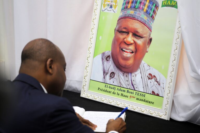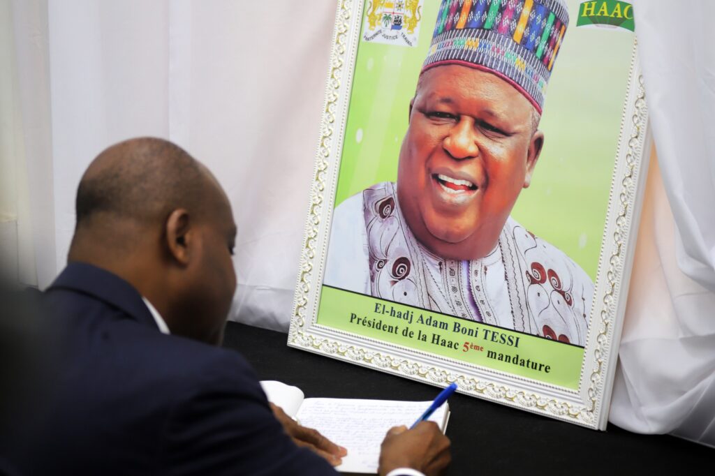 Dans la cour de la HAAC, les visages exprimaient une émotion partagée. À son arrivée, le Professeur SOSSA a d’abord eu un bref entretien avec son homologue de la HAAC, Edouard Cocou LOKO. Puis, il est allé signer le livre de condoléances, y inscrivant son témoignage personnel. Le Président de la Haute juridiction a écrit : » Le President Adam Boni TESSI a marqué de son empreinte l’histoire de nos institutions. Son sens aigue de l’éthique et sa vision éclairée resteront des références pour les générations futures. »