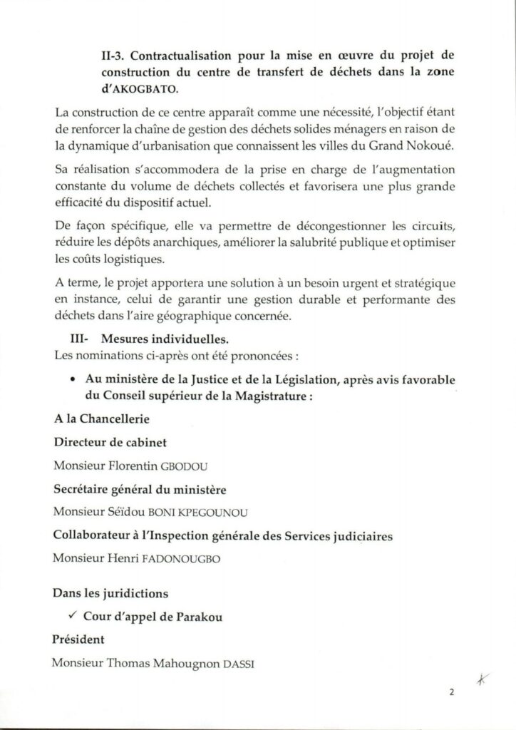 Le Conseil des ministres s’est réuni ce mercredi 21 janvier 2026 sous la présidence du Chef de l’État, Patrice TALON. Au cours de cette session, les membres du gouvernement ont adopté plusieurs décisions dont : La construction du marché au charbon et de pharmacopée ; la finalisation du processus d’indemnisation des personnes affectées par le projet d’aménagement et de bitumage de la route des Pêches phase 1 (Tronçon Cotonou – Adounko) ; la Contractualisation pour la mise en œuvre du projet de construction du Centre de transfert de déchets dans la zone d’Akogbato.