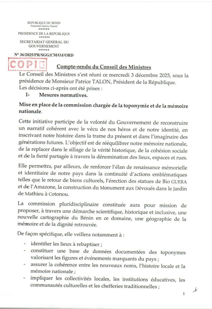 Parmi les décisions prises en conseil des ministres, figure la mise en place de la commission chargée de la toponymie et de la mémoire nationale. Cette initiative participe de la volonté du gouvernement de reconstruire un narratif cohérent avec le vécu des héros et l’identité béninoise, en inscrivant l’histoire dans la trame du présent et dans l’imaginaire des générations futures. L’objectif est de rééquilibrer la mémoire nationale,.de la replacer dans le sillage de la vérité historique, de la cohésion sociale et de la fierté partagée à travers la dénomination des lieux, espaces et rues.