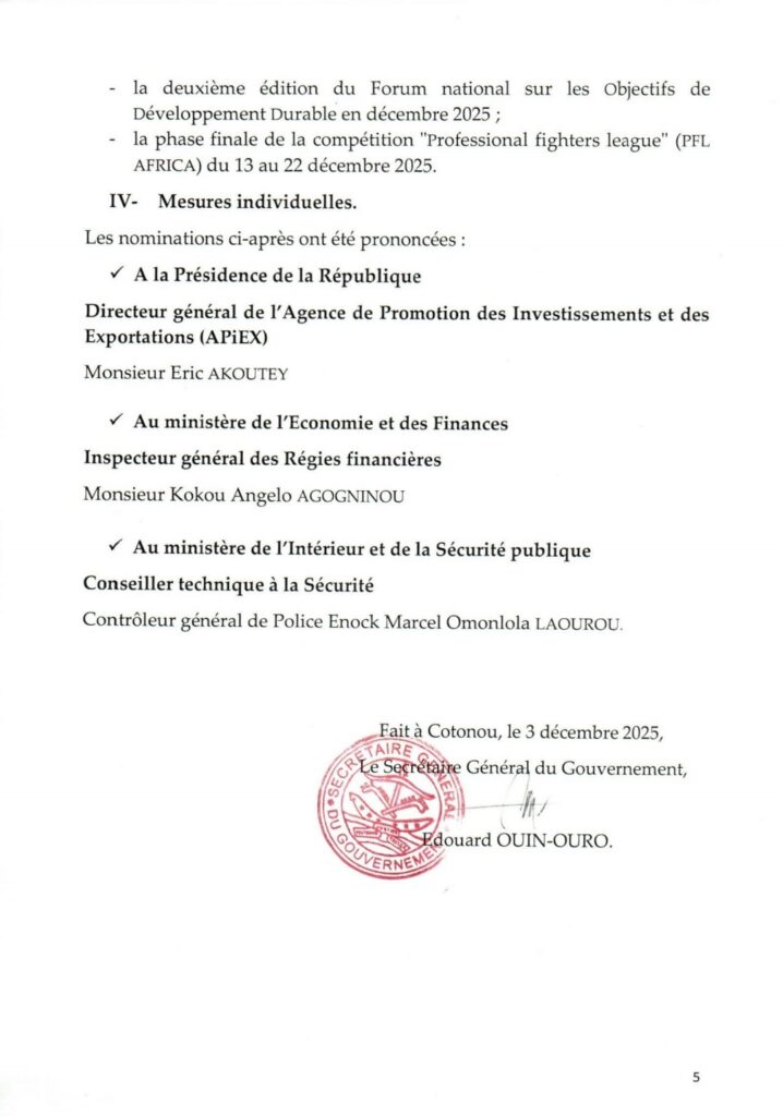Le Conseil des ministres s’est réuni ce mercredi 3 décembre 2025 sous la houlette du Président de la République, Patrice Talon. Au cours de cette session hebdomadaire, les membres du gouvernement béninois ont pris d’importantes décisions.