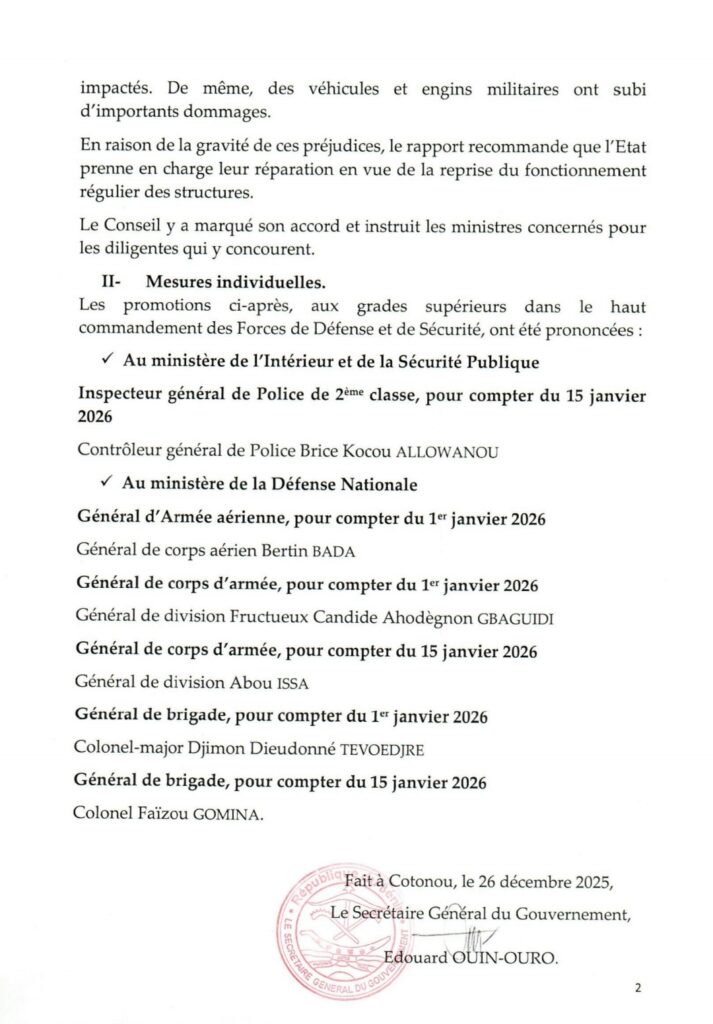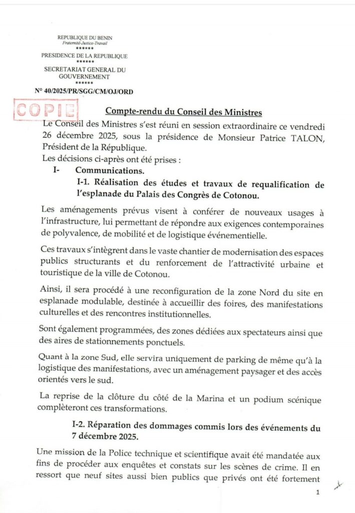 Le gouvernement s’est réuni le vendredi 26 décembre 2025 pour une session extraordinaire des ministres sous la houlette du Chef de l’État Patrice Talon. D’importantes décisions ont été prises au cours de cette session gouvernementale.