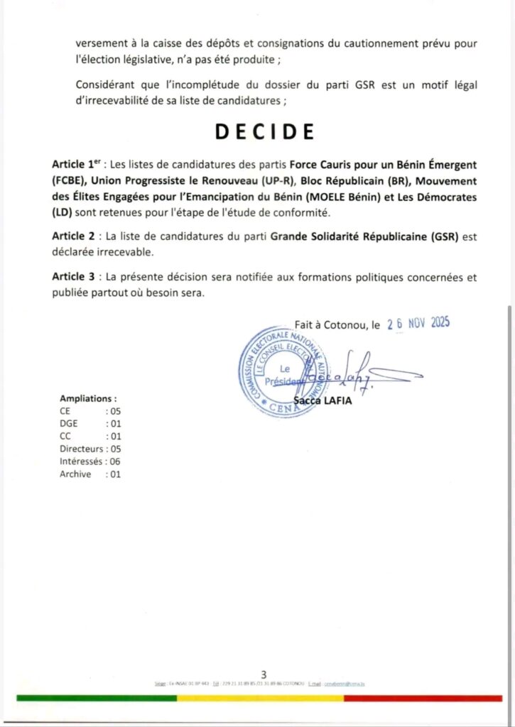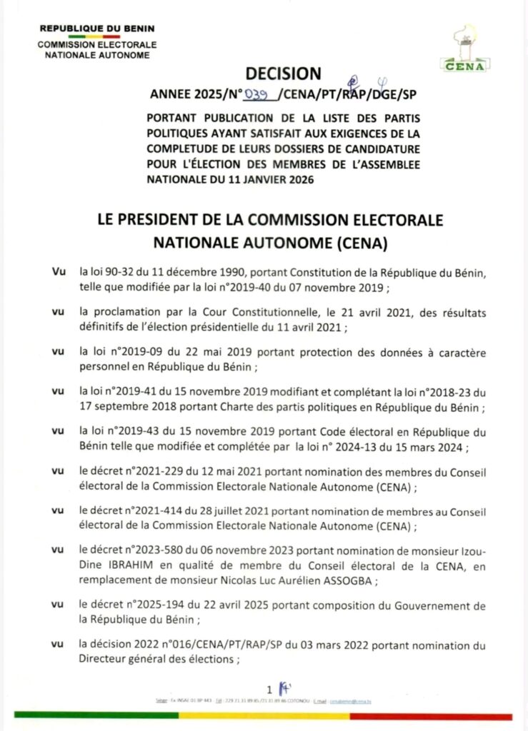 La Commission Électorale Nationale Autonome (CENA) a publié ce mercredi 26 Novembre 2025, la liste des partis politiques ayant satisfait aux exigences de la complétude de leurs dossiers de candidature pour l’élection des membres de l’Assemblée Nationale du 11 janvier 2026. Sur les six partis qui ont initialement déposé leurs dossiers, cinq ont pu franchir cette étape.