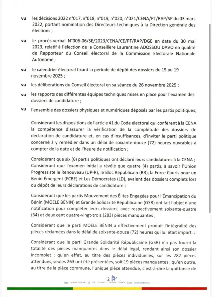 Pour leur part, les partis Mouvement des Élites Engagées pour l’Émancipation du Bénin (MOELE-BÉNIN) et Grande Solidarité Républicaine (GSR) ont fait l’objet d’une notification pour compléter leurs dossiers, avec respectivement soixante-quatre (64) et deux cent quatre-vingt trois (283) pièces manquantes.