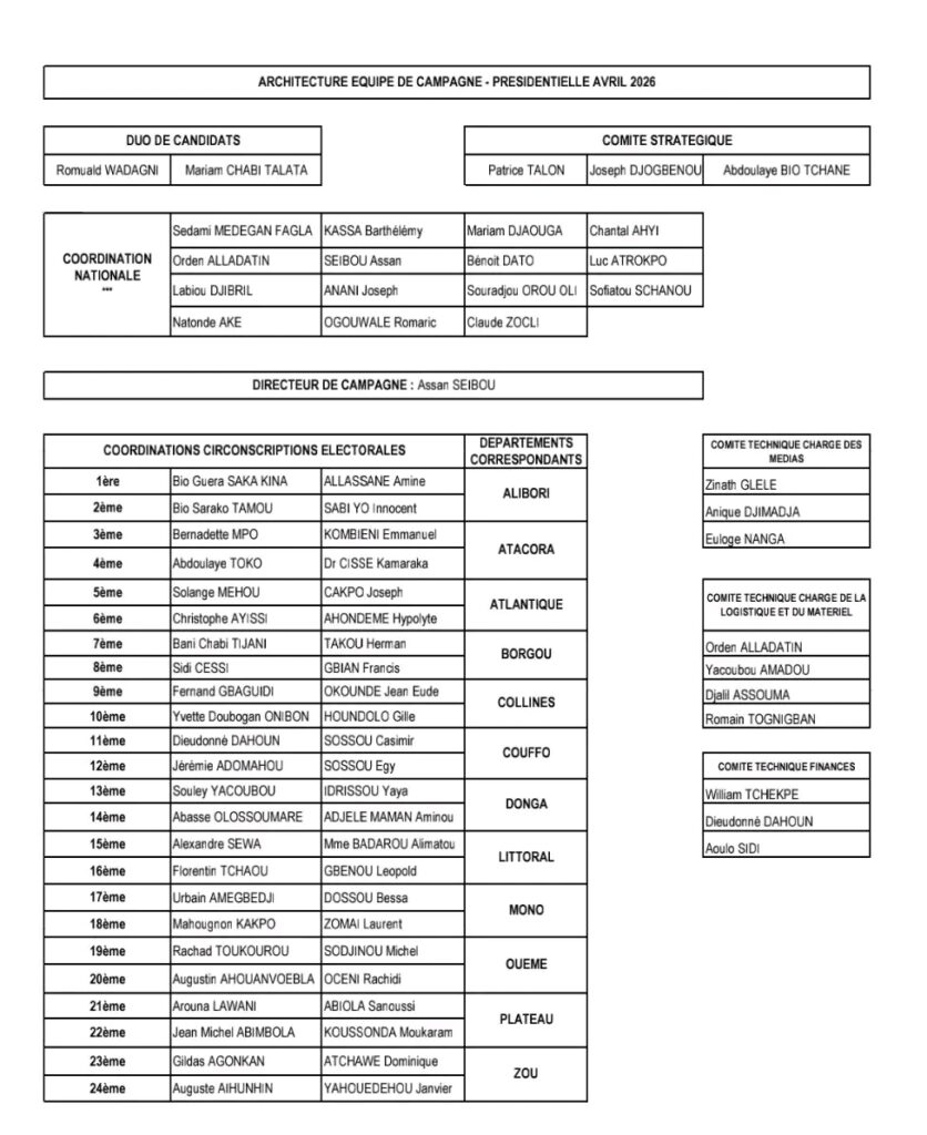 Député et élu de la 14e circonscription électorale, l’honorable Assan SEIBOU est le Directeur de campagne. Une coordination nationale composée de quatre membres est mise en place. Deux membres sont désignés dans chacune des 24 circonscriptions électorales pour mener à bien les campagnes au profit du duo Wadagni-Talata.
