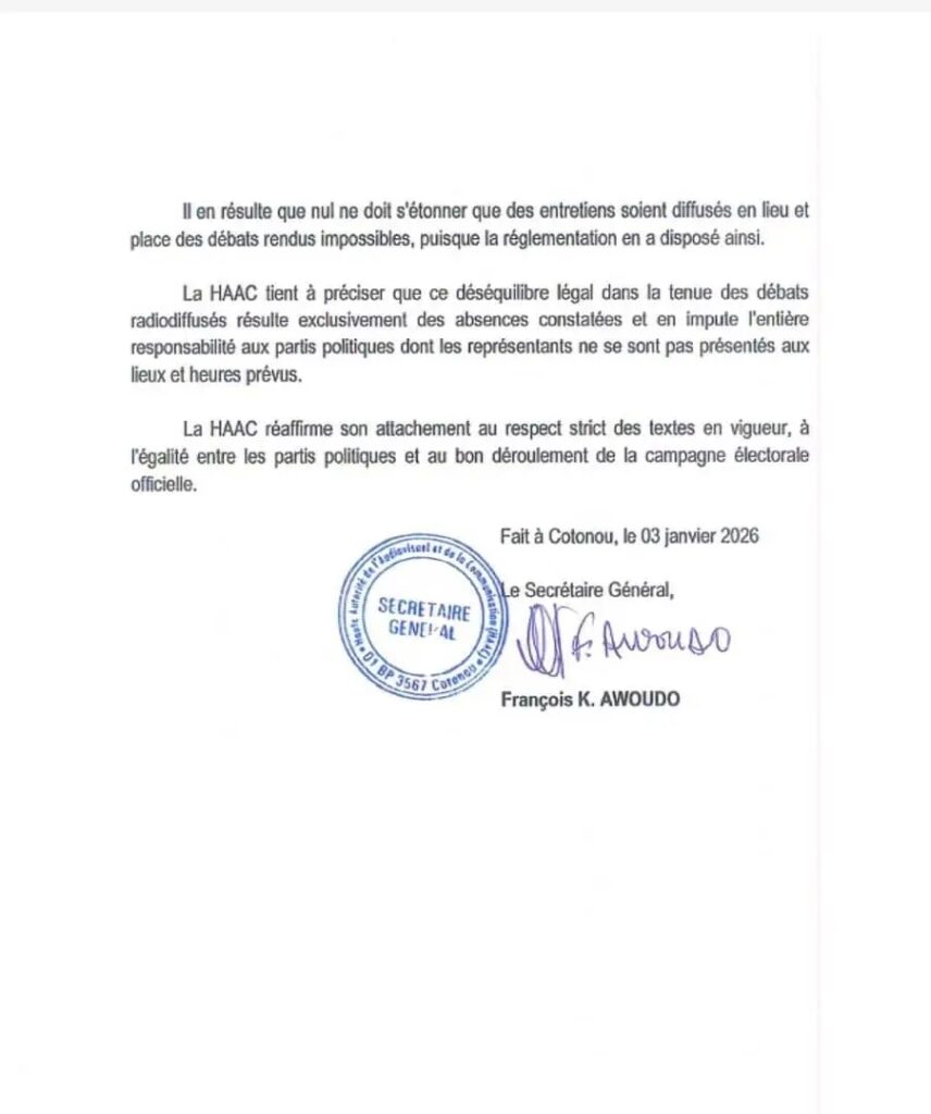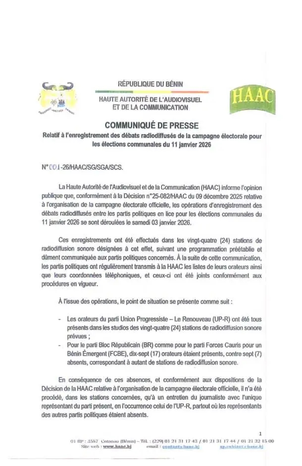 Dans le cadre de l’enregistrement des débats rediffusés entre partis politiques en lice pour les élections Communales du 11 janvier, la Haute Autorité de l’Audiovisuel et la Communication (HAAC) a, à travers un communiqué dénoncé l’absence des orateurs des partis BR et FCBE dans sept (07) radiodiffusions sur les 24 reparties sur l’ensemble du territoire national.