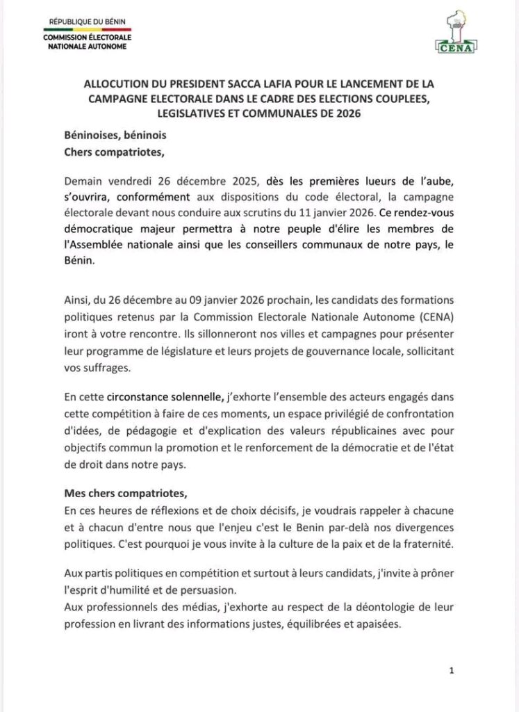 Home » Blog » Lancement de la campagne électorale pour les législatives et communales du 11 janvier 2026 par la CENA : Le Président Sacca Lafia exhorte les acteurs à jouer leur partition dans le respect des règles démocratiques