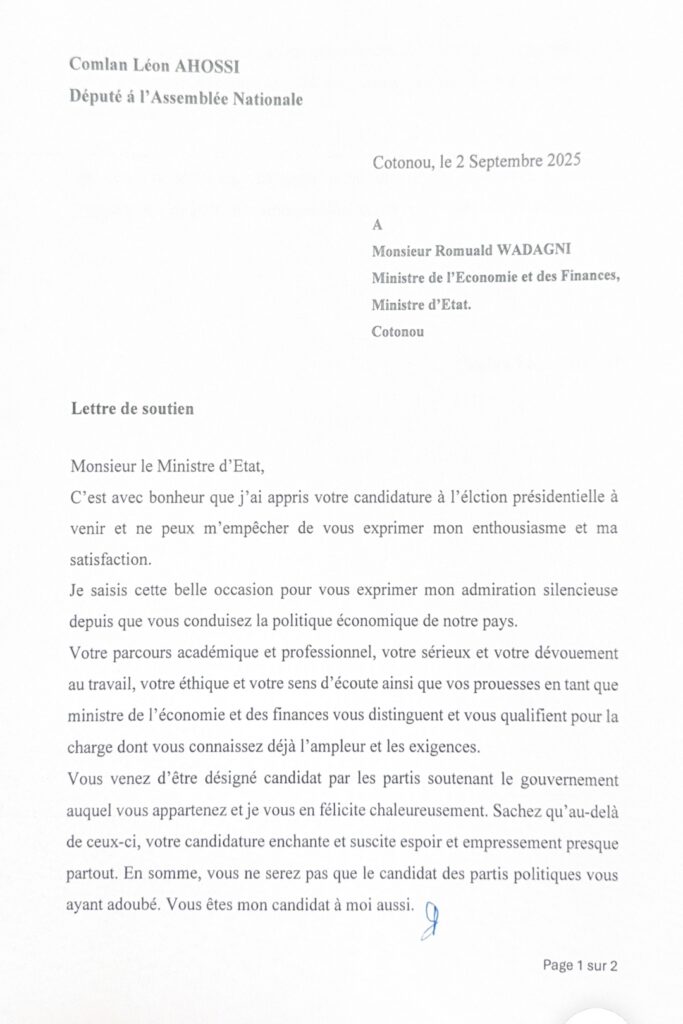 (Lire l’intégralité de la lettre de soutien du député Comlan Léon AHOSSI adressée au Ministre Romuald Wadagni)