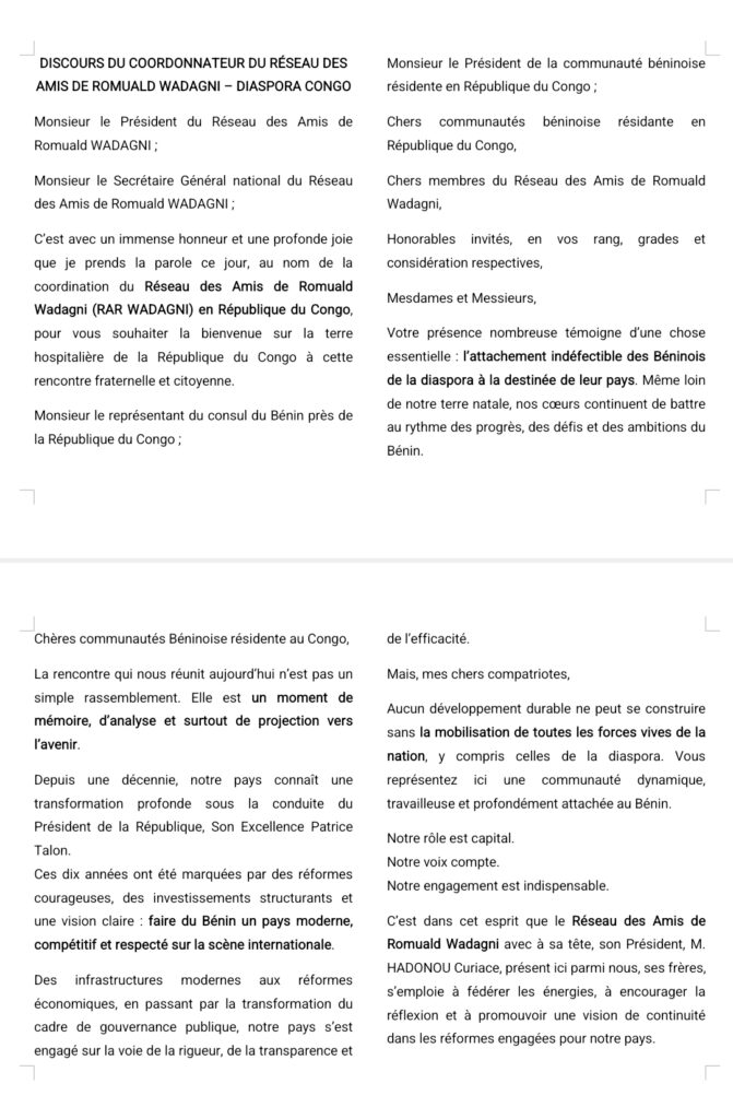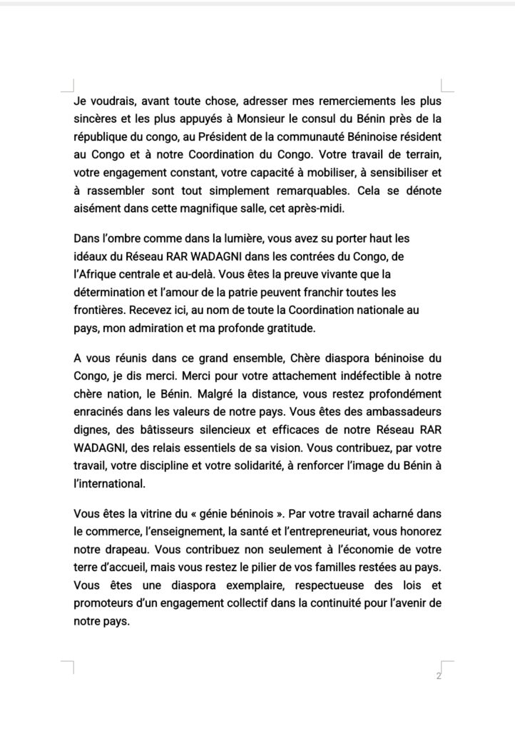 Conduite par le président du réseau, Curiace Cinna Hadonou, accompagné du Secrétaire général François Affomaï, la délégation du RAR-WADAGNI a procédé à l’installation officielle de l’équipe dirigeante locale. À l’issue de cette mise en place, Franklin Kounou a été désigné coordonnateur du réseau en République du Congo, avec pour mission de structurer et d’animer les actions de mobilisation sur l’ensemble du territoire congolais.
