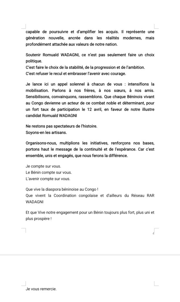 La campagne présidentielle prend une dimension résolument internationale pour Romuald Wadagni. Le dimanche 22 mars 2026 restera une date marquante dans la structuration de son mouvement de soutien à l’extérieur du territoire national. À Brazzaville, capitale de la République du Congo, la coordination du Réseau des Amis de Romuald Wadagni (RAR-WADAGNI) a été officiellement installée, dans une ambiance empreinte d’engagement et de ferveur militante.