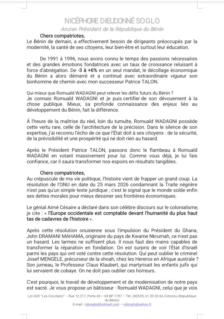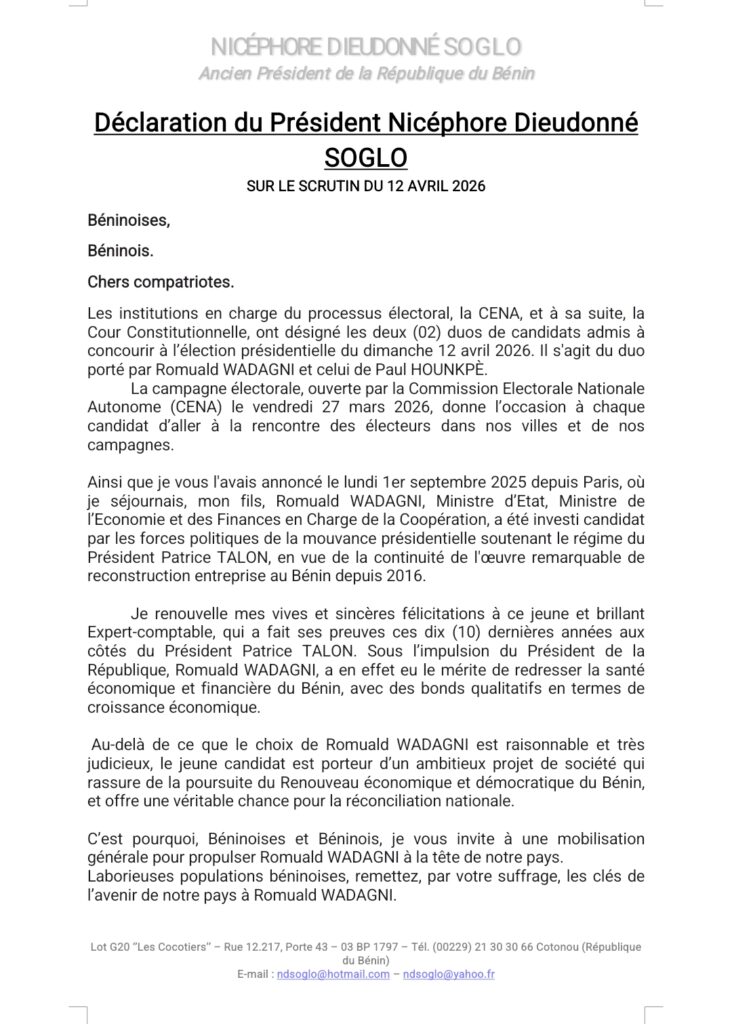 Dans une déclaration solennelle, l’ancien président Nicéphore Dieudonné Soglo affiche un soutien clair au duo Romuald Wadagni – Mariam Chabi Talata. Saluant le bilan économique du régime de Patrice Talon et appelant à la continuité, il invite les Béninois à voter massivement en faveur du candidat de la mouvance, qu’il présente comme le garant du renouveau économique, de la stabilité et de la réconciliation nationale. Lire l’intégralité de sa déclaration.