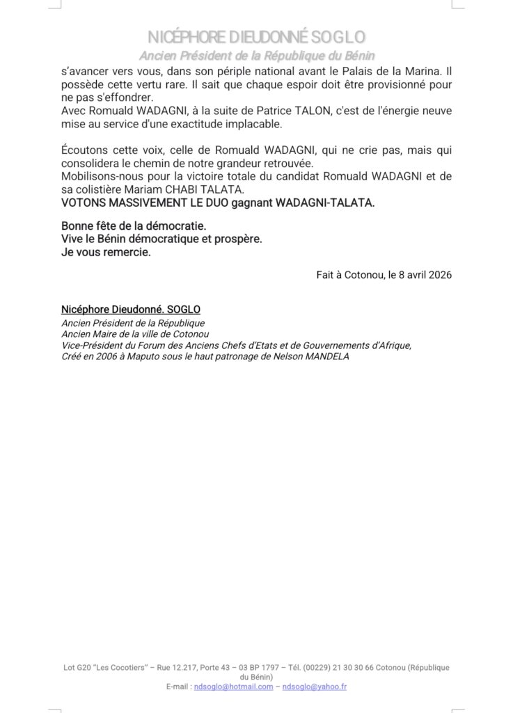 Home » Blog » Nicephore Dieudonné Soglo à propos du scrutin du 12 avril 2026 au Bénin : « Passons le flambeau à Romuald Wadagni »
