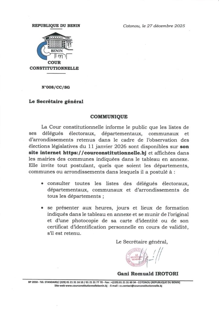 À travers un communiqué en date du 27 décembre 2025 et signé de son secrétaire général, Gani Romuald IROTORI, la Cour Constitutionnelle informe le public que les listes de ses délégués électoraux, départementaux, communaux et d’arrondissements retenus dans le cadre de l’observation des élections législatives du 11 janvier 2026 sont disponibles sur son site internet https :// courconstitutionnelle.bj. Elles sont également affichées dans les mairies des communes indiquées dans le tableau en annexe.
