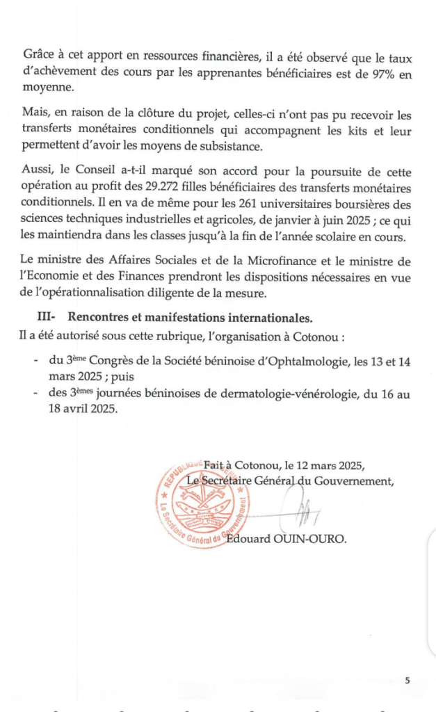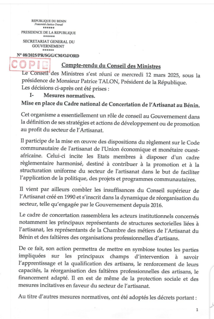 Le Conseil des ministres s’est réuni ce mercredi 12 mars 2025 sous le présidence du Chef de l’État Patrice TALON. Au cours de cette séance hebdomadaire du gouvernement, de nombreuses décisions ont été prises pour le développement du Bénin.