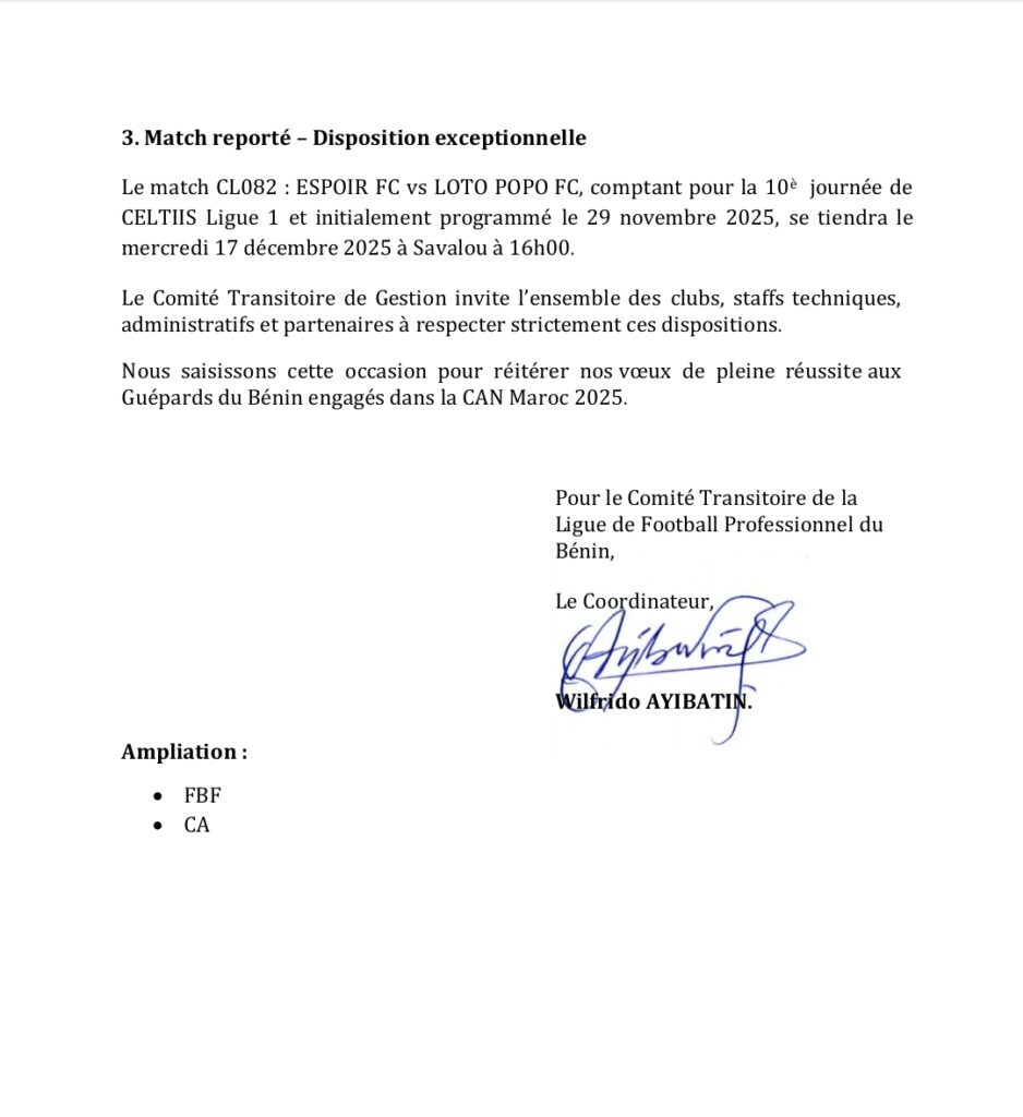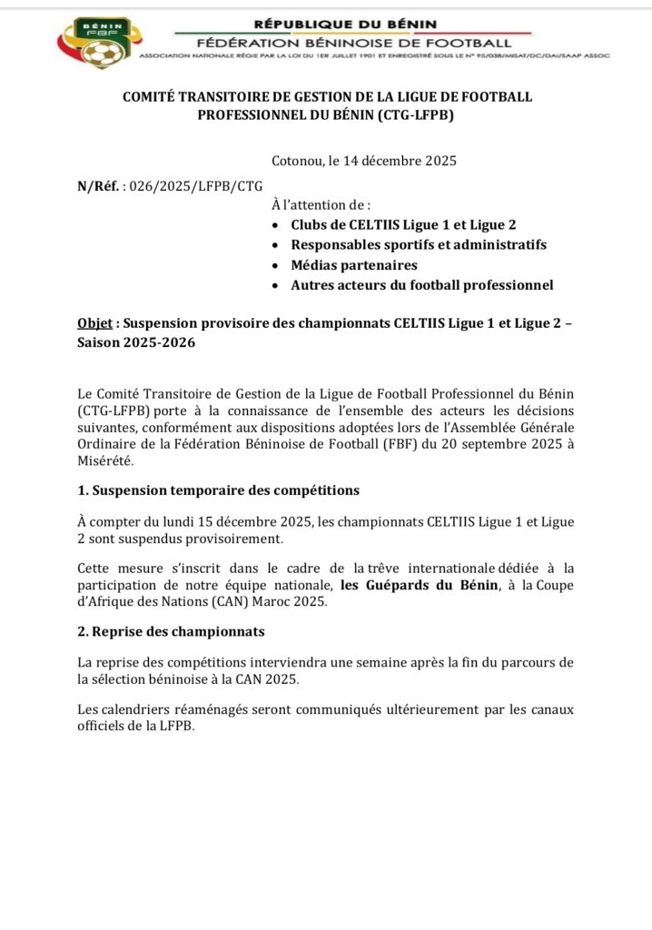 Dès le 15 décembre 2025, les championnats Celtiis Ligue 1 et 2 sont provisoirement suspendus. Le Comité transitoire informe également que la reprise interviendra une semaine après la fin du parcours de la sélection béninoise à la CAN 2025.