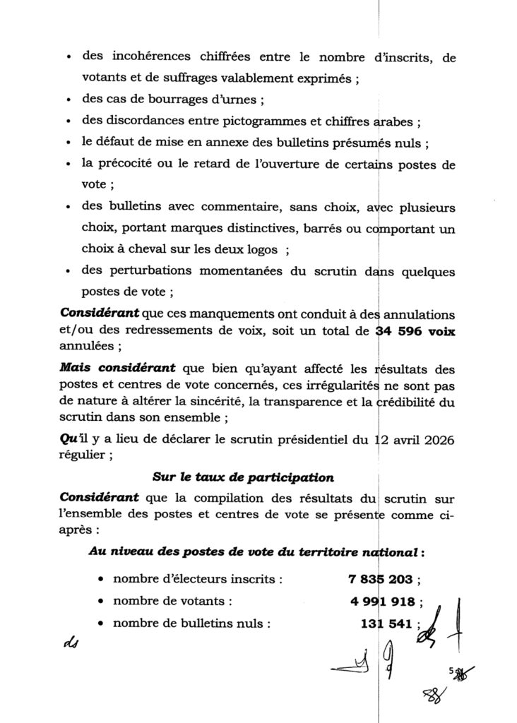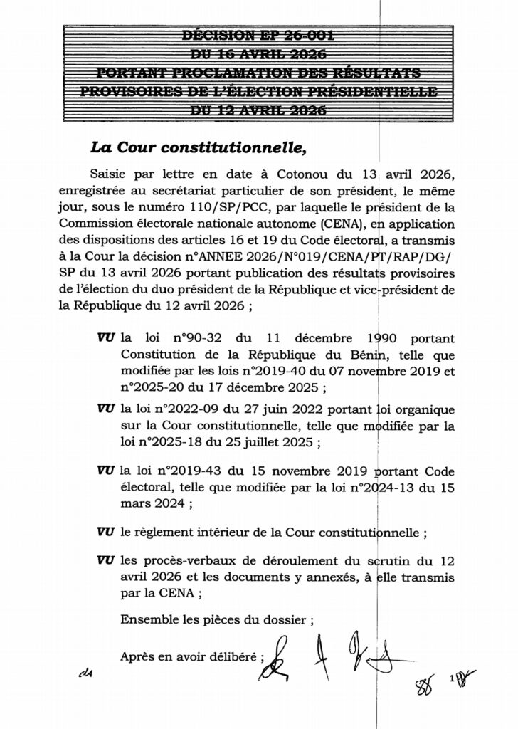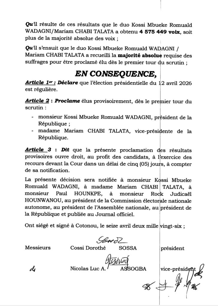 En validant la régularité du scrutin du 12 avril 2026 et en proclamant les résultats provisoires, la Cour constitutionnelle consacre la victoire du duo Romuald Wadagni – Mariam Chabi Talata dès le premier tour. Une décision majeure qui conforte la crédibilité du processus électoral tout en ouvrant la séquence des recours, prélude à l’installation d’un nouveau pouvoir exécutif attendu sur des résultats concrets. Lire l’intégralité de la décision de la Cour Constitutionnelle.