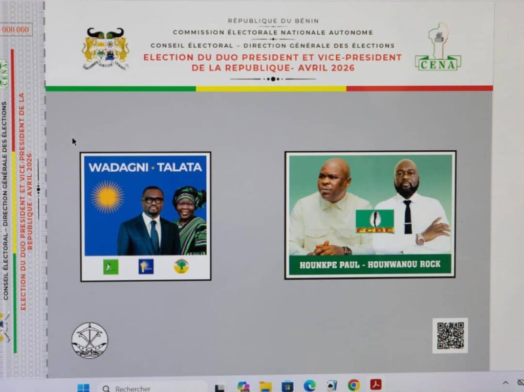 Deux candidatures sont définitivement retenues pour la présidentielle du 12 avril 2026 au Bénin. Il s’agit de Romuald Wadagni, ministre des Finances porté par la majorité présidentielle et alliés, avec Mariam Chabi Talata comme colistière, et Paul Hounkpè, désigné par le parti Force Cauris pour un Bénin Émergent (FCBE), accompagné de Judicael Hounwanou comme candidat à la vice-présidence.
