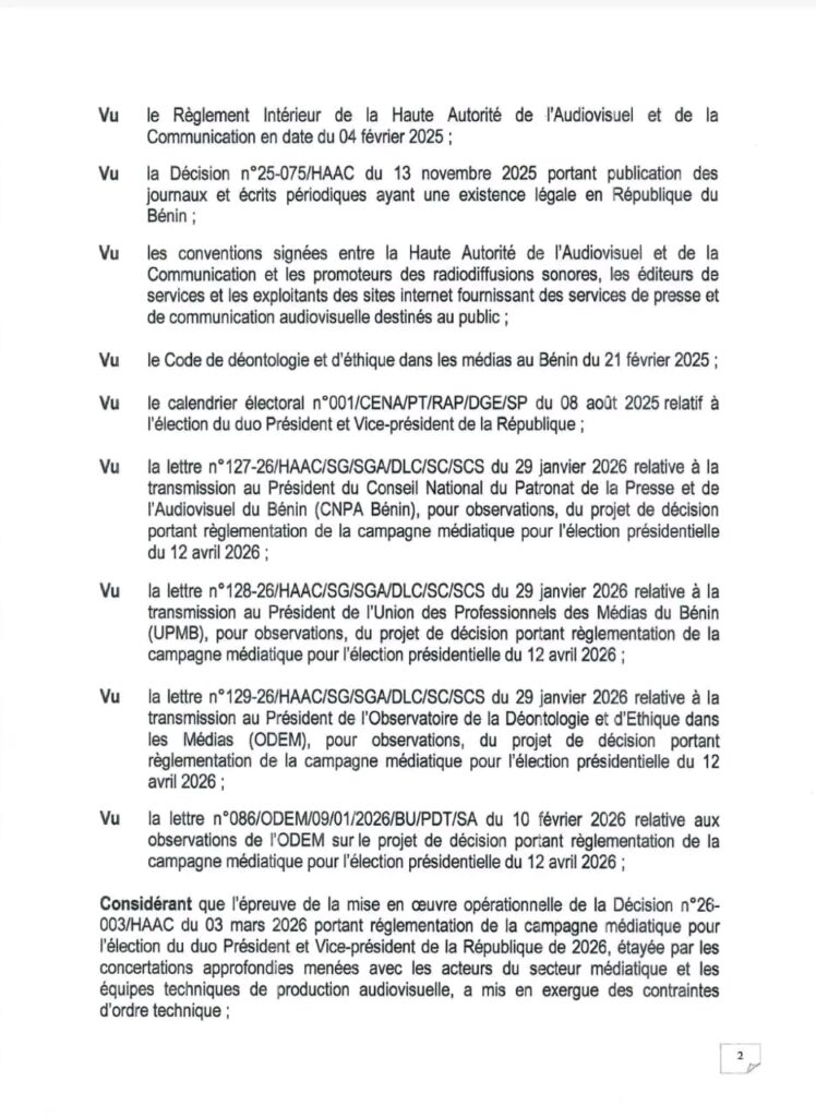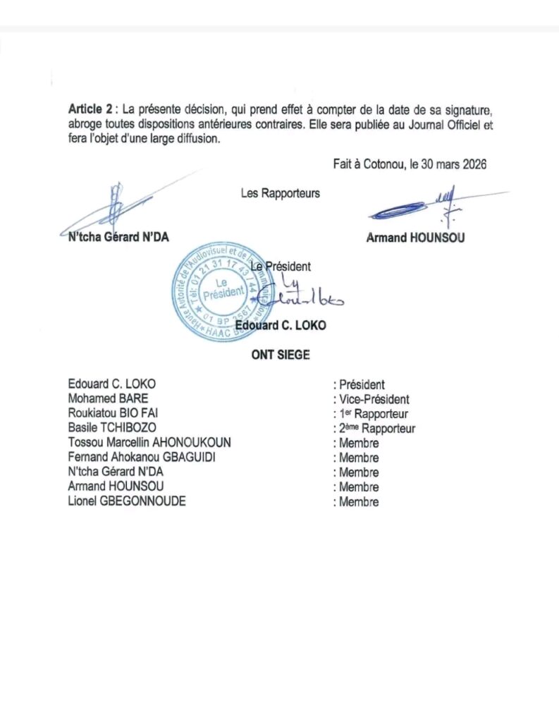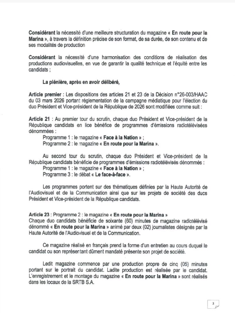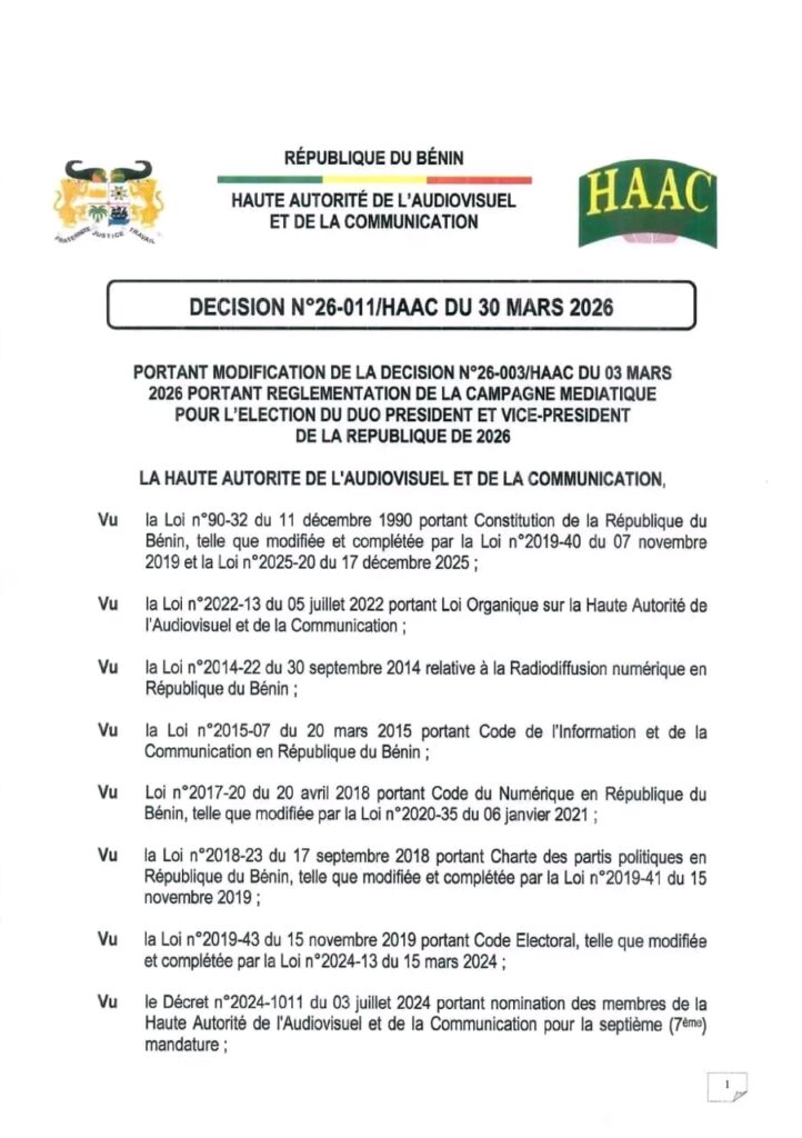 L’élection présidentielle du 12 avril prochain approche à grands pas. Démarrée le 27 mars 2026, la campagne électorale se poursuit et les candidats essaient de convaincre les populations autour de leur projet de société. Dans ce processus, les médias, encadrés par la Haute Autorité de l’Audiovisuel et de la Communication (HAAC) jouent un rôle crucial de relais des messages des candidats. Par la décision N°26-011 du 30 mars 2026, signée du Président de son Président, la HAAC modifie la décision N°26-003 du 03 mars 2026 portant règlementation de la campagne médiatique pour l’élection du duo Président de la République et Vice-président de la République.