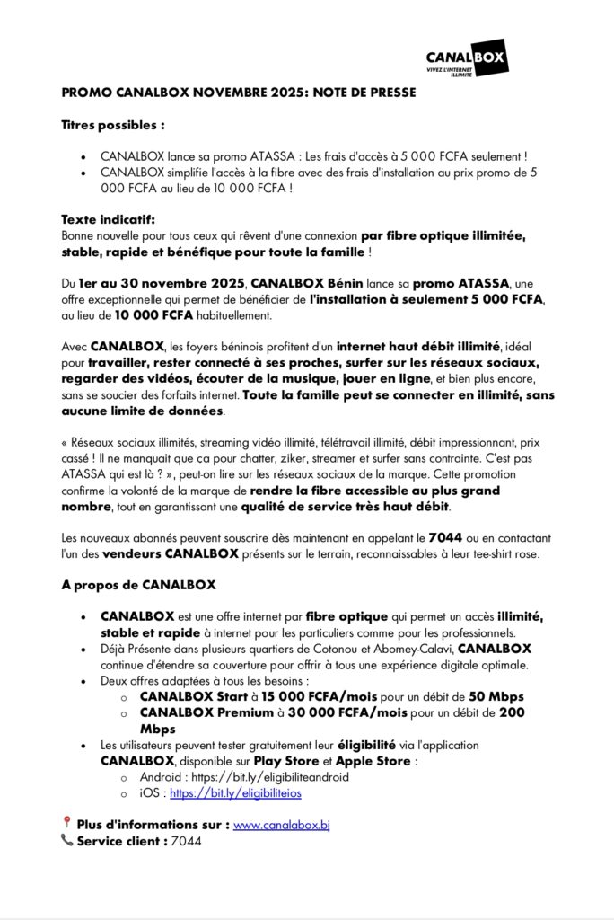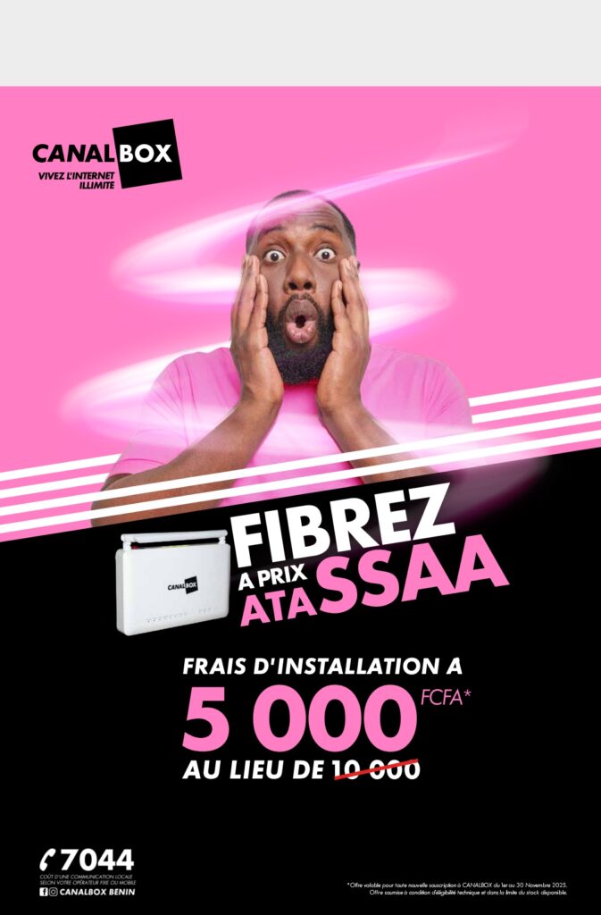CANALBOX Bénin rend la fibre optique encore plus accessible ! Du 1er au 30 novembre 2025, la marque lance sa promo ATASSA, une offre exceptionnelle qui divise par deux les frais d’installation, désormais fixés à 5 000 FCFA seulement. Une belle opportunité pour les foyers béninois de profiter d’un internet illimité, stable et ultra-rapide, à un prix défiant toute concurrence.