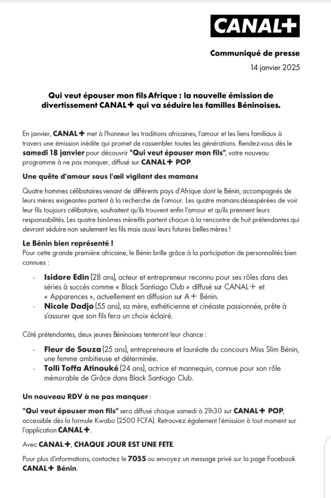 Toujours dans l’optique d’innover pour apporter plus de satisfaction à ses abonnés, Canal + vient d’insérer dans sa grille de programme, une nouvelle émission de divertissement.  » Qui veut épouser mon fils Afrique  » sera diffusé sur Canal+ Pop à partir du samedi 18 janvier 2025 et va explorer les traditions africaines, l’amour ainsi que les liens familiaux.