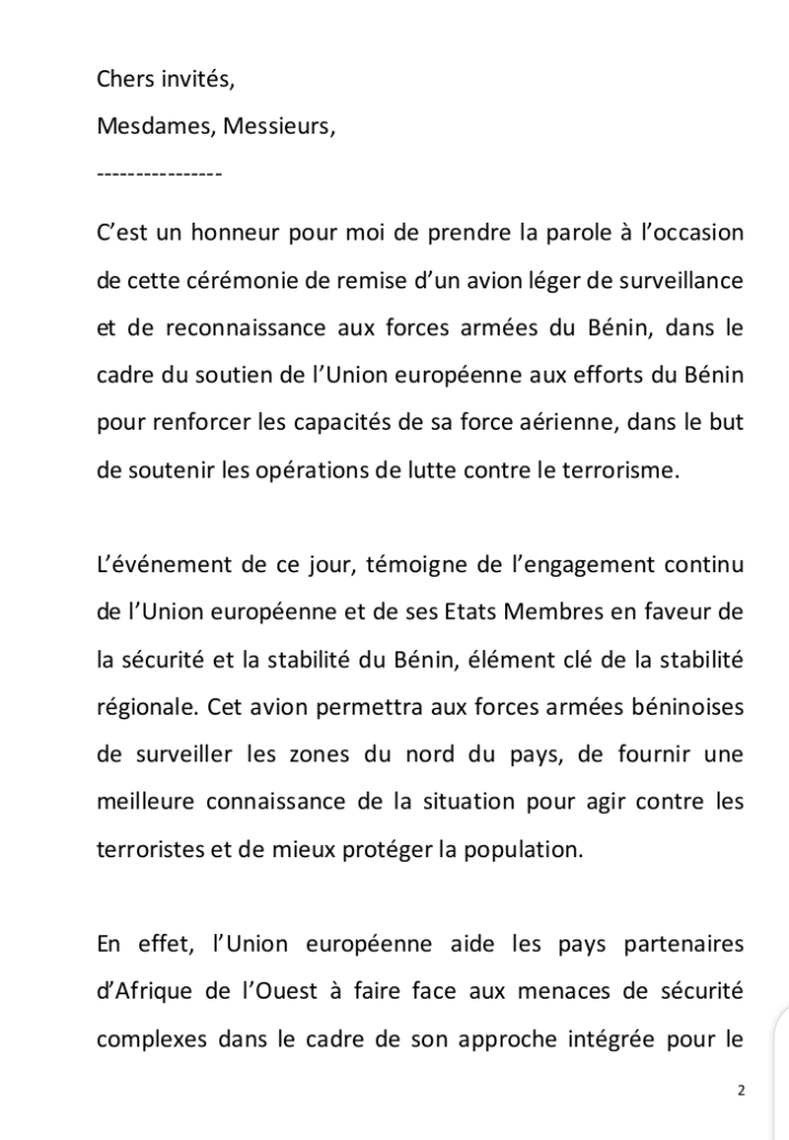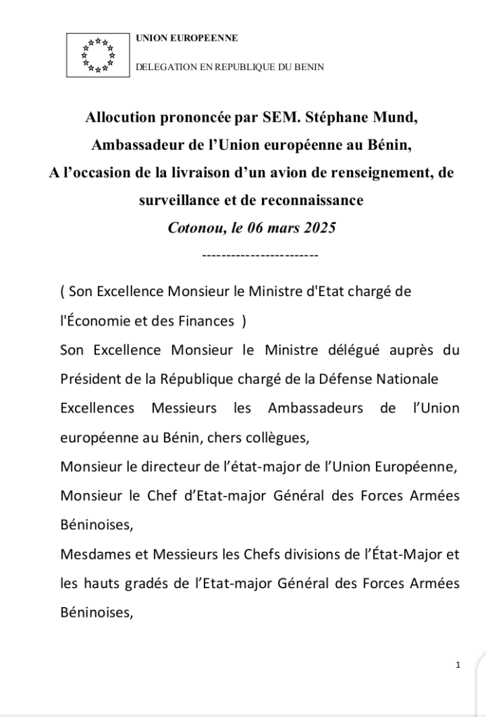 L’Union européenne a procédé ce jeudi 6 mars 2025, à la remise officielle d’un avion léger de surveillance et de reconnaissance aux forces armées du Bénin, dans le cadre de son soutien aux efforts du Bénin pour renforcer les capacités de sa force aérienne, dans la but de soutenir les opérations de lutte contre le terrorisme. La cérémonie s’est déroulée en présence du ministre chargé de la Défense nationale, Fortunet Nouatin, de l’Ambassadeur de l’EU au Bénin Stéphane Lundi, des ambassadeurs des États membres de l’Union européenne au Bénin que sont l’Allemagne, la Belgique, la France, Le Luxembourg et les Pays-Bas ; du Directeur de l’Etat-major de l’Union européenne, le Général Michel Van Der Laan ; du Directeur d’Etat-major Général des Forces Armées béninoises, le Général Fructueux GBAGUIDI ; des chefs divisions et des hauts gradés de l’Etat-major Général des Forces Armées Béninoises.