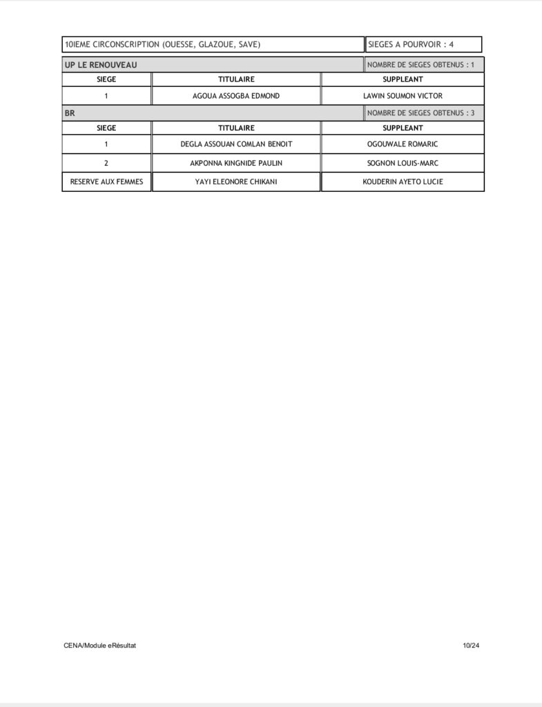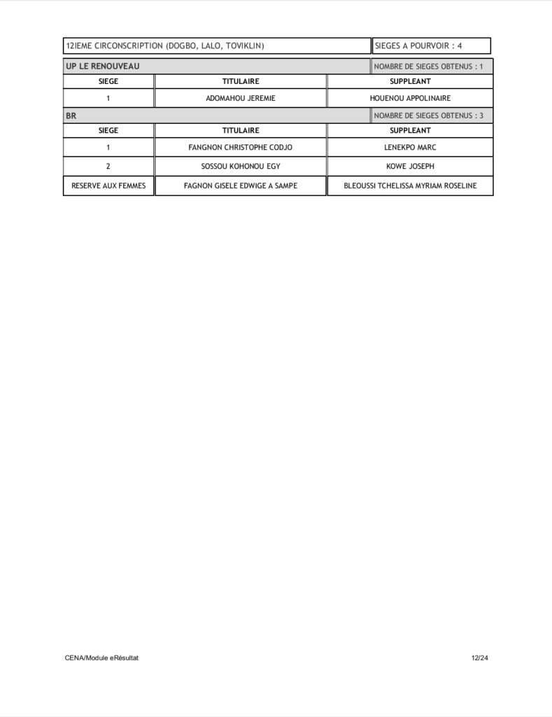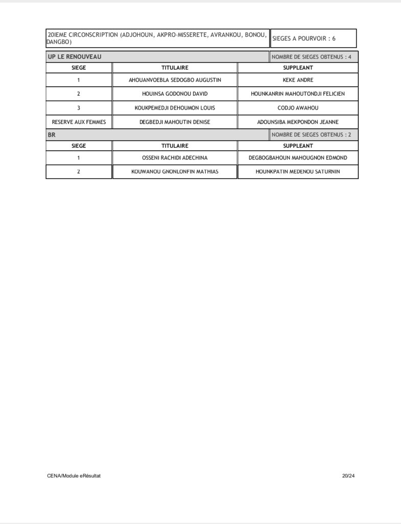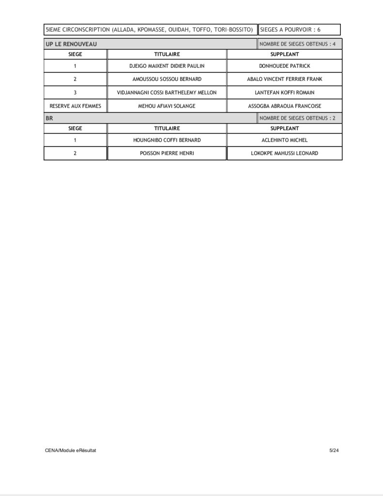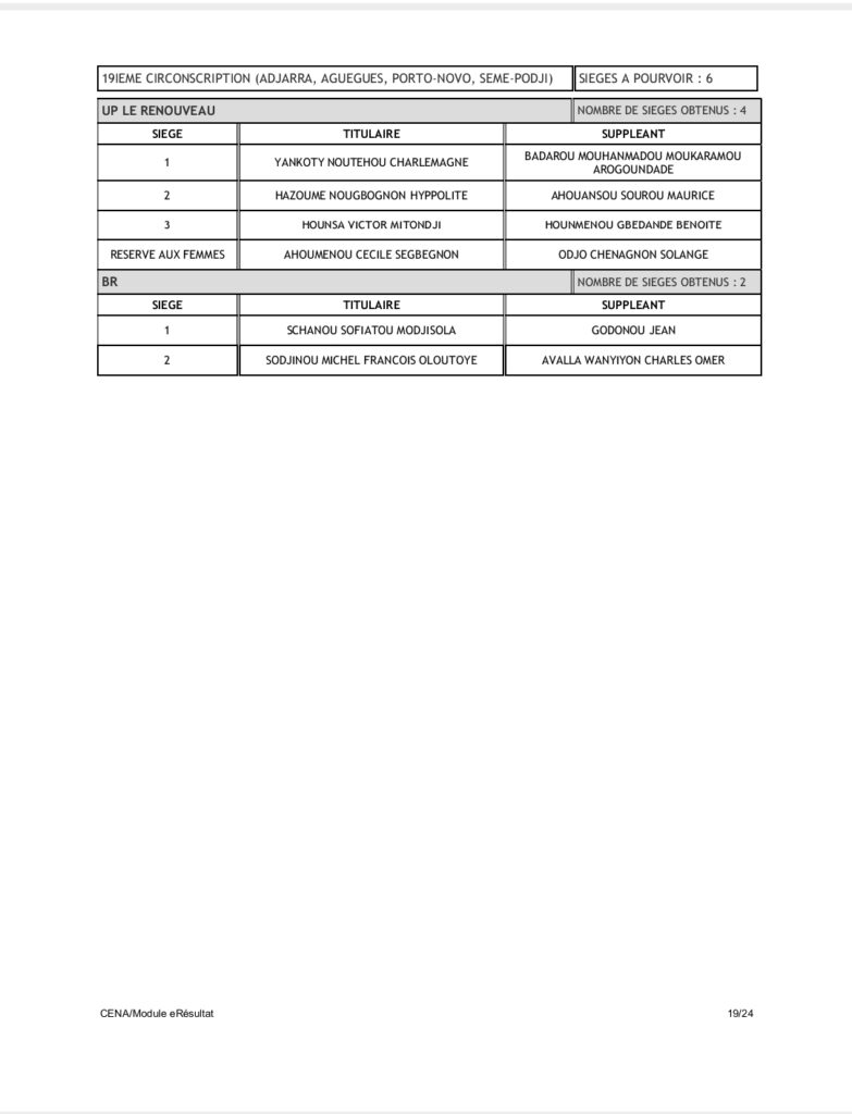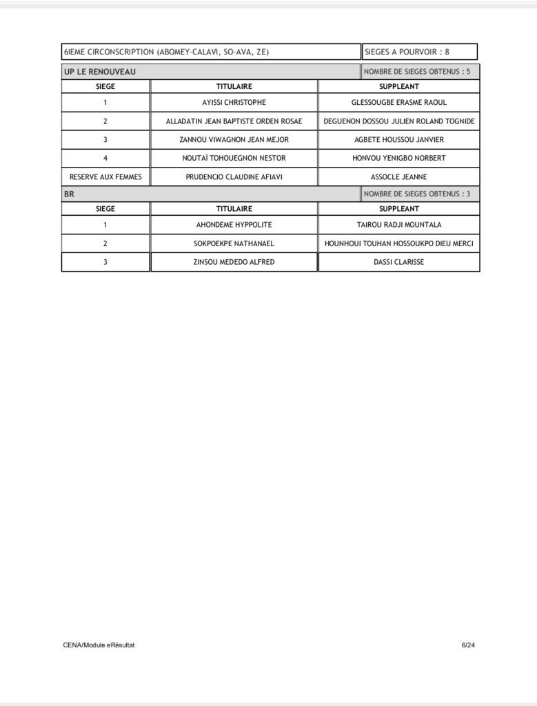 Tenant compte du code électoral, seuls les partis BR et UP-R ont obtenu la répartition de l’ensemble des 109 sièges soit 60 pour UP-R et 49 pour le BR. Pas donc de députés pour LD, FCBE et Moele-Bénin.