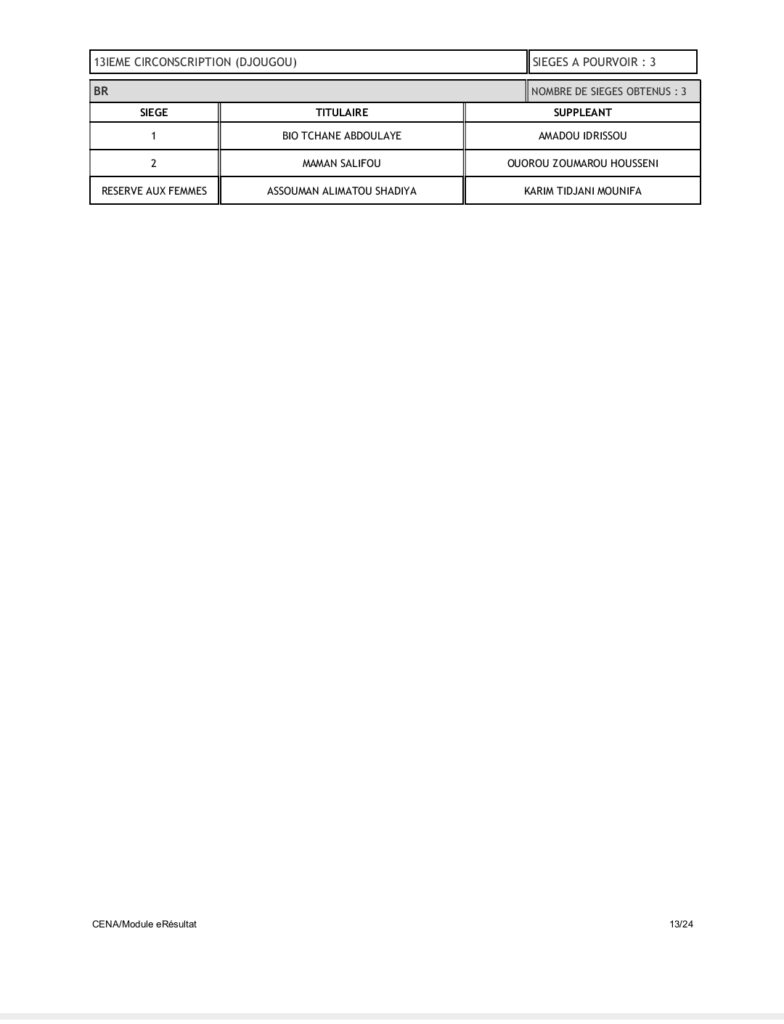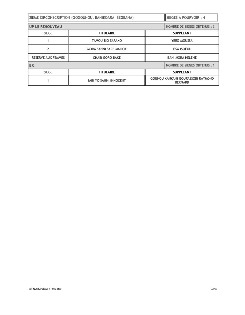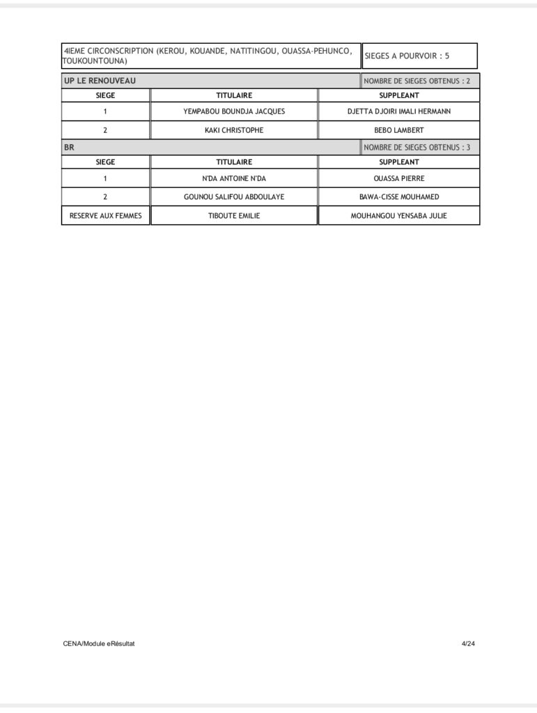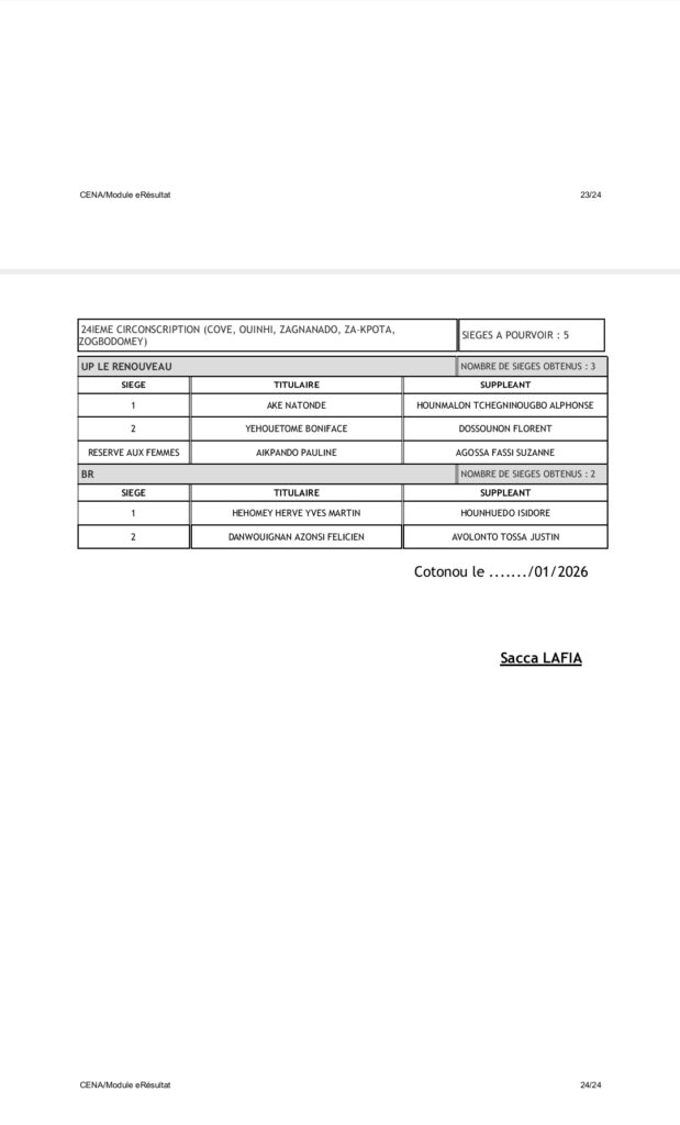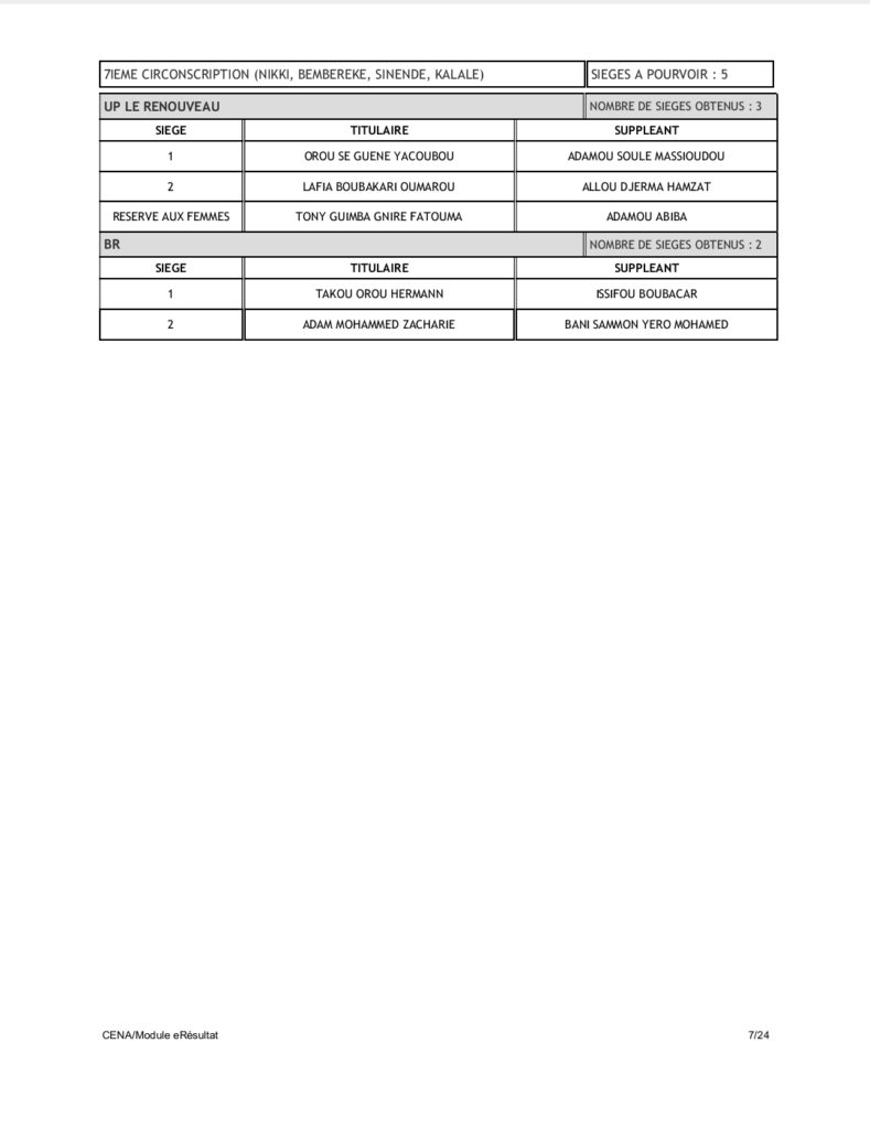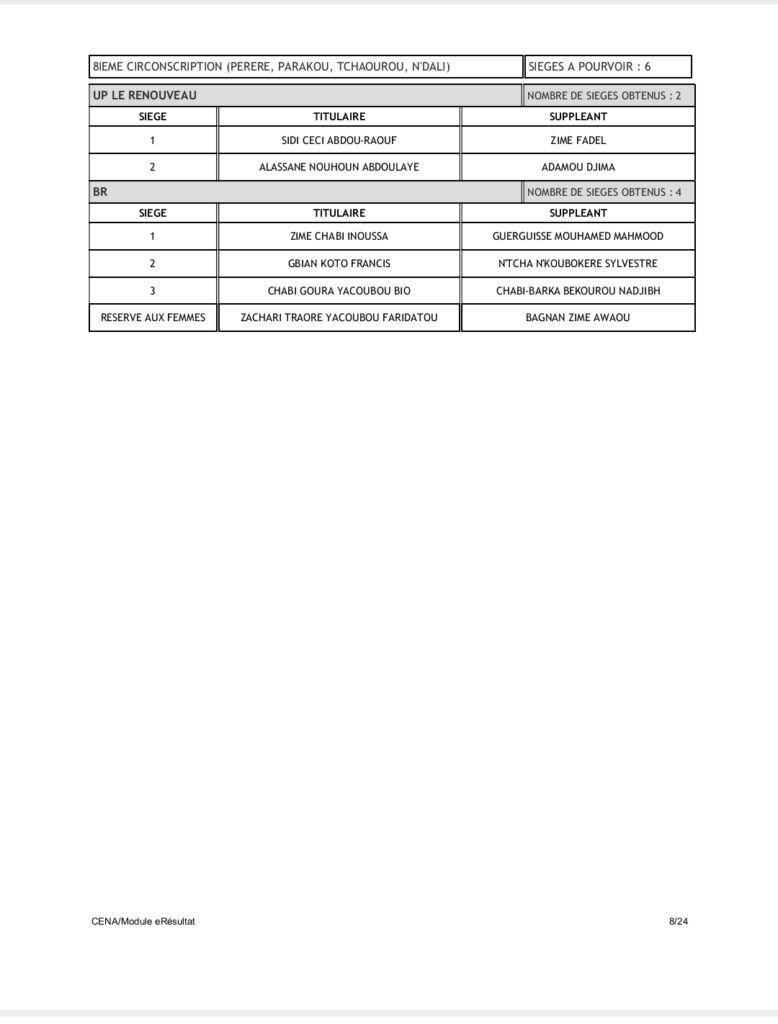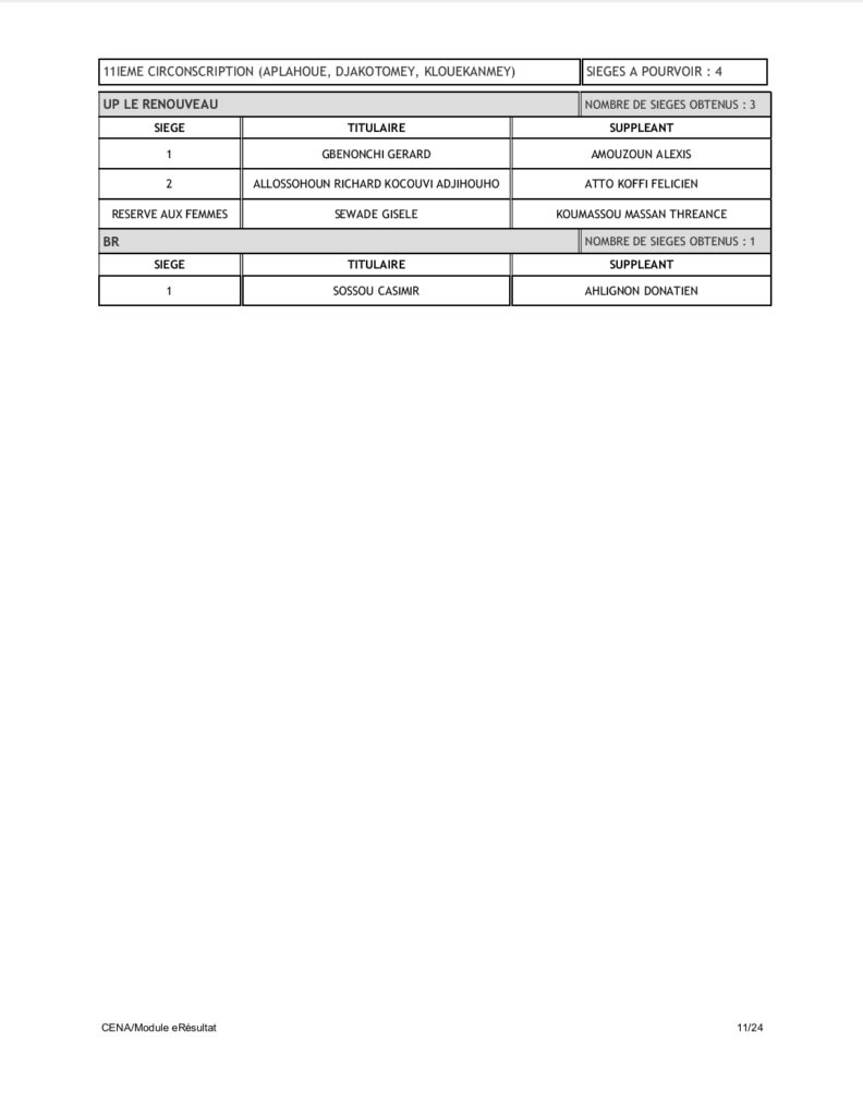 Tenant compte du code électoral, seuls les partis BR et UP-R ont obtenu la répartition de l’ensemble des 109 sièges soit 60 pour UP-R et 49 pour le BR. Pas donc de députés pour LD, FCBE et Moele-Bénin.