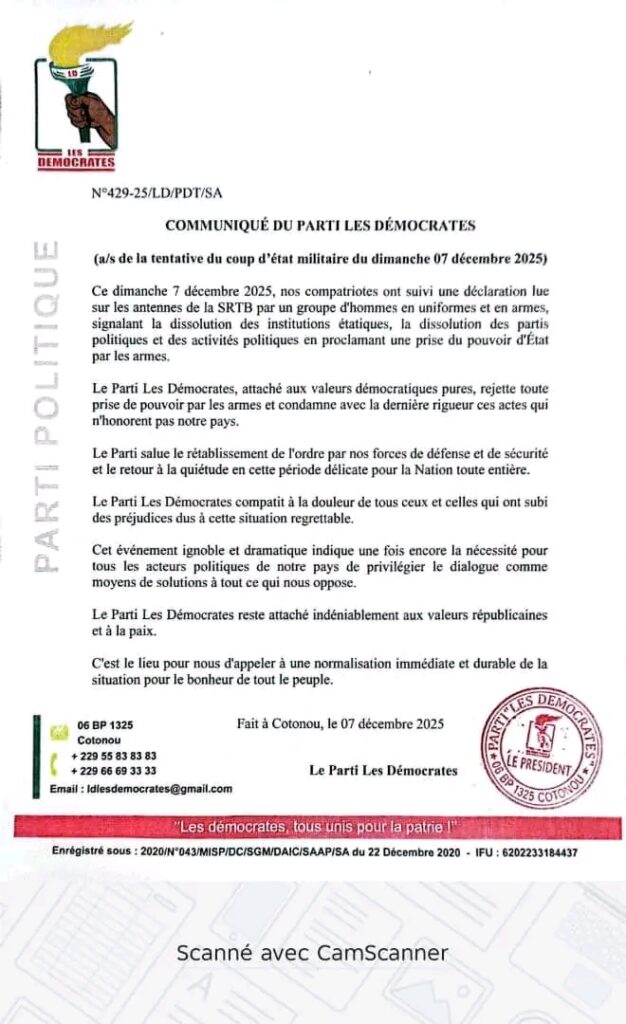 Des réactions s’enchaînent après les événements de ce dimanche 07 décembre 2025 relatifs à la tentative du putsch dont le Bénin a été victime. À travers un communiqué, le parti Les Démocrates s’est prononcé en remettant toute prise de pouvoir par les armes et condamne avec la dernière rigueur ces actes qui n’honorent pas le Bénin. Le principal parti de l’opposition salue le rétablissement de l’ordre par les forces de défense et de sécurité et le retour à la quiétude.