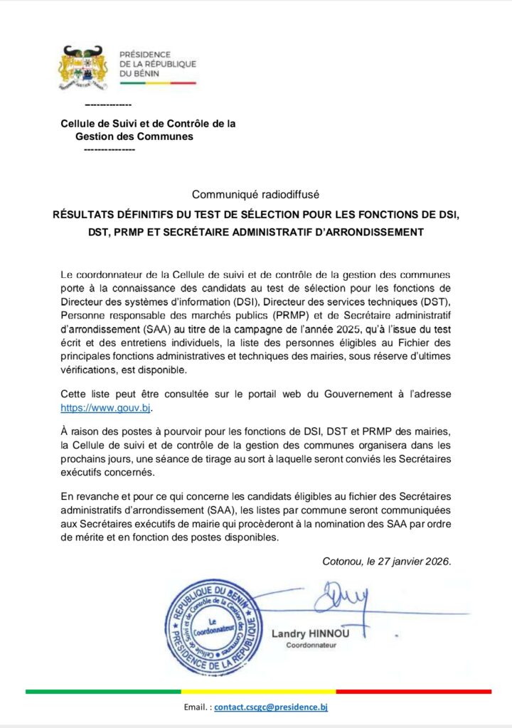 À travers un communiqué en date du 27 janvier 2026, la Coordonnateur de la Cellule de suivi et de Contrôle de la gestion des communes informe les candidats au test de sélection pour les fonctions de Directeur des systèmes d’information (DSI), Directeur des services techniques (DST) Personne responsable des marchés publics (PRMP) et de Secrétaire Administratif d’arrondissement (SAA) au titre de la campagne de l’année 2025, qu’à l’issue du test écrit et des entretiens individuels, la liste des personnes éligibles au Fichier des principales fonctions administratives et techniques des mairies, sous réserve d’ultimes vérifications, est disponible.