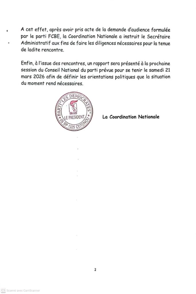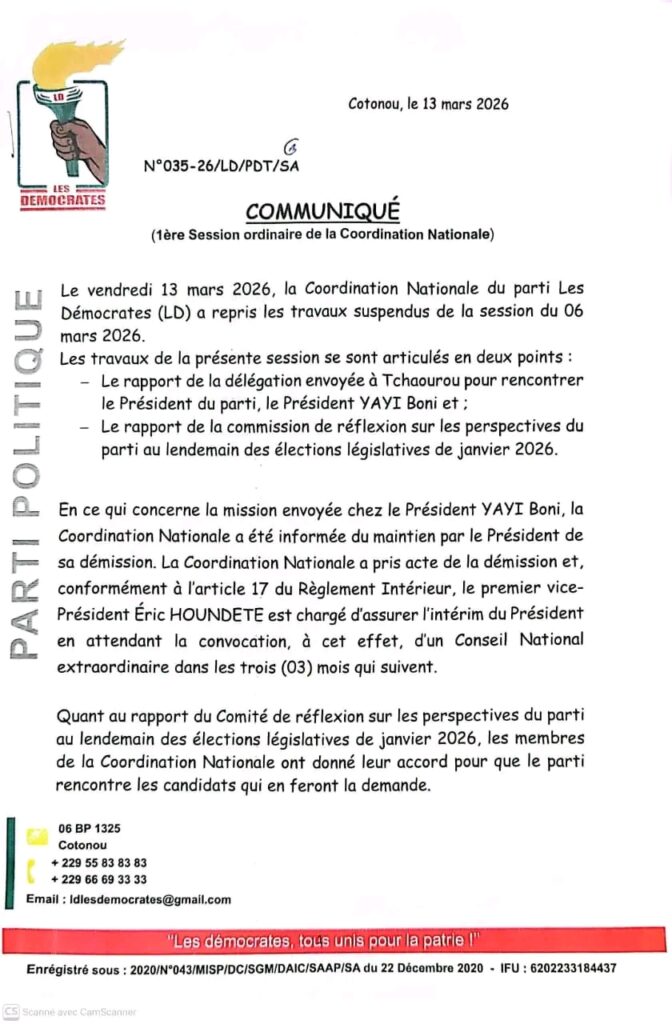 Par un communiqué en date du 13 mars 2026, la Coordination Nationale du parti Les Démocrates a annoncé la tenue du Conseil National pour le 21 mars prochain. Plusieurs points seront au menu des échanges. Il sera entre autres questions des perspectives après les législatives du 11 janvier 2026, la réorganisation du parti après la démission de son Président Boni Yayi et le point de la rencontre avec les responsables de la FCBE.