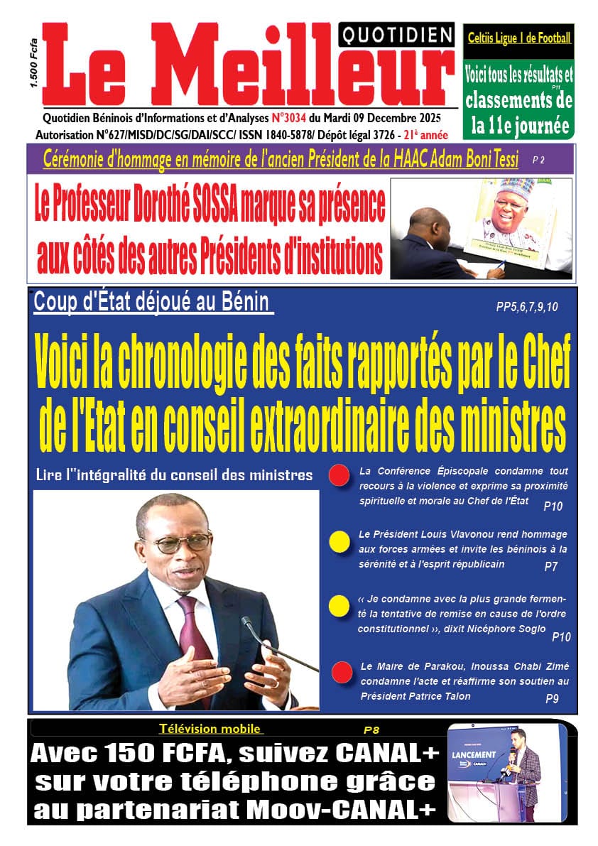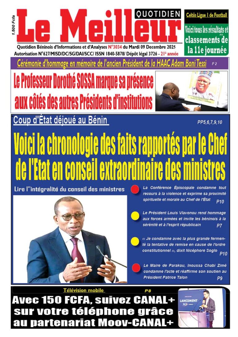 Voici la Une de ce Mardi 09 Décembre 2025. Bonne lecture à tous.